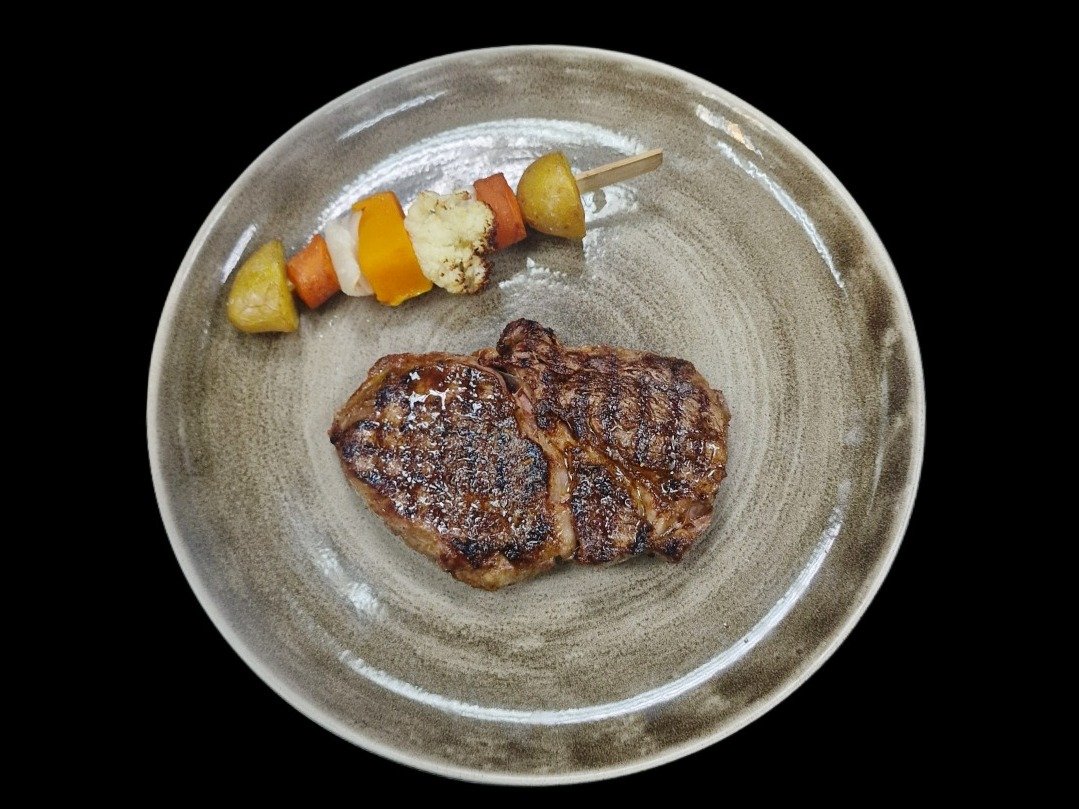 Στο πιάτο συνοδεύουν το rib-eye λαχανικά όπως καρότο, πιπεριά, πατάτα baby, κουνουπίδι και κρεμμύδι. Πρώτα μαγειρεύονται στον ατμό και έπειτα ψήνονται στο grill, διατηρώντας τη φυσική γεύση και υφή τους. Είναι ένας έξυπνος, πολύχρωμος και τραγανός συνδυασμός που ισορροπεί τέλεια με το πλούσιο κρέας.
