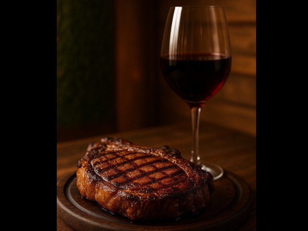 Rib-eye Black Angus – ζουμερό, πλούσιο σε ενδομυϊκό λίπος, ιδανικό με ένα ποτήρι Cabernet Sauvignon.