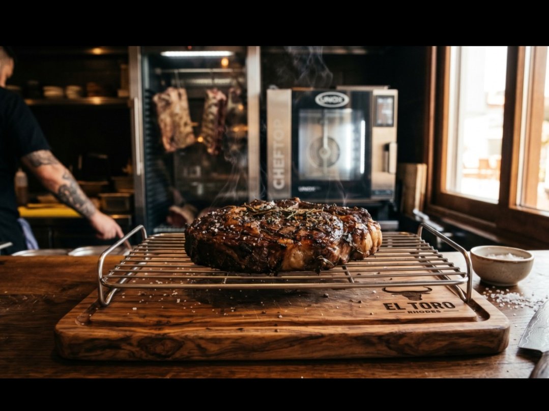 Στον κόσμο της γρήγορης κατανάλωσης, έχουμε συνηθίσει να θεωρούμε ότι το «καλό» φαγητό είναι αυτό που φτάνει στο τραπέζι αχνιστό, αμέσως μόλις βγει από τη σχάρα. Στο El Toro Steak House στη Ρόδο, λειτουργούμε με First Principles. Η θερμοδυναμική μας λέει κάτι διαφορετικό: ένα steak που κόβεται αμέσως μόλις βγει από τον Unox Cheftop είναι ένα steak που "αιμορραγεί" την ποιότητά του πάνω στο ξύλο κοπής, αντί να την κρατάει μέσα στις ίνες του.